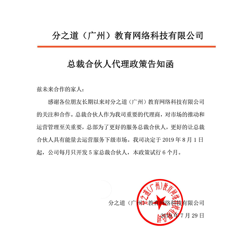 感謝各位朋友長期以來對分之道 jiaoyuwangluokejiyouxiangongsideguanzhuhehezuo。zongcaihehuorenzuoweiwosizhongyaodedailishang,duishichangdetuidongheyunyingguanlizhiguanzhongyao,zongbuweilegenghaodefuwuzongcaihehuoren,genghaoderangzongcaihehuorenjuyounengliangquyunyingfuwuxiajishichang。wosijuedingyu2019年8月1日起,公司每月隻開發5家總裁合夥人,本政策試行6個月。