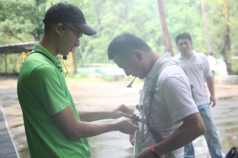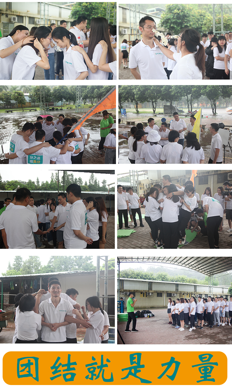 由於公司的人數有120來人,所以拓展活動便分A、B兩組錯開進行。早上9:00,我們A組的人員便到達了番禺的曆奇山莊,開始進行了以小組為單位的——貼鼻子和團隊協作比賽。外邊雖然下著大雨,不過大家的熱情絲毫沒有受到影響,尖叫聲、歡呼聲此起彼伏,每位小夥伴玩得可開心了!