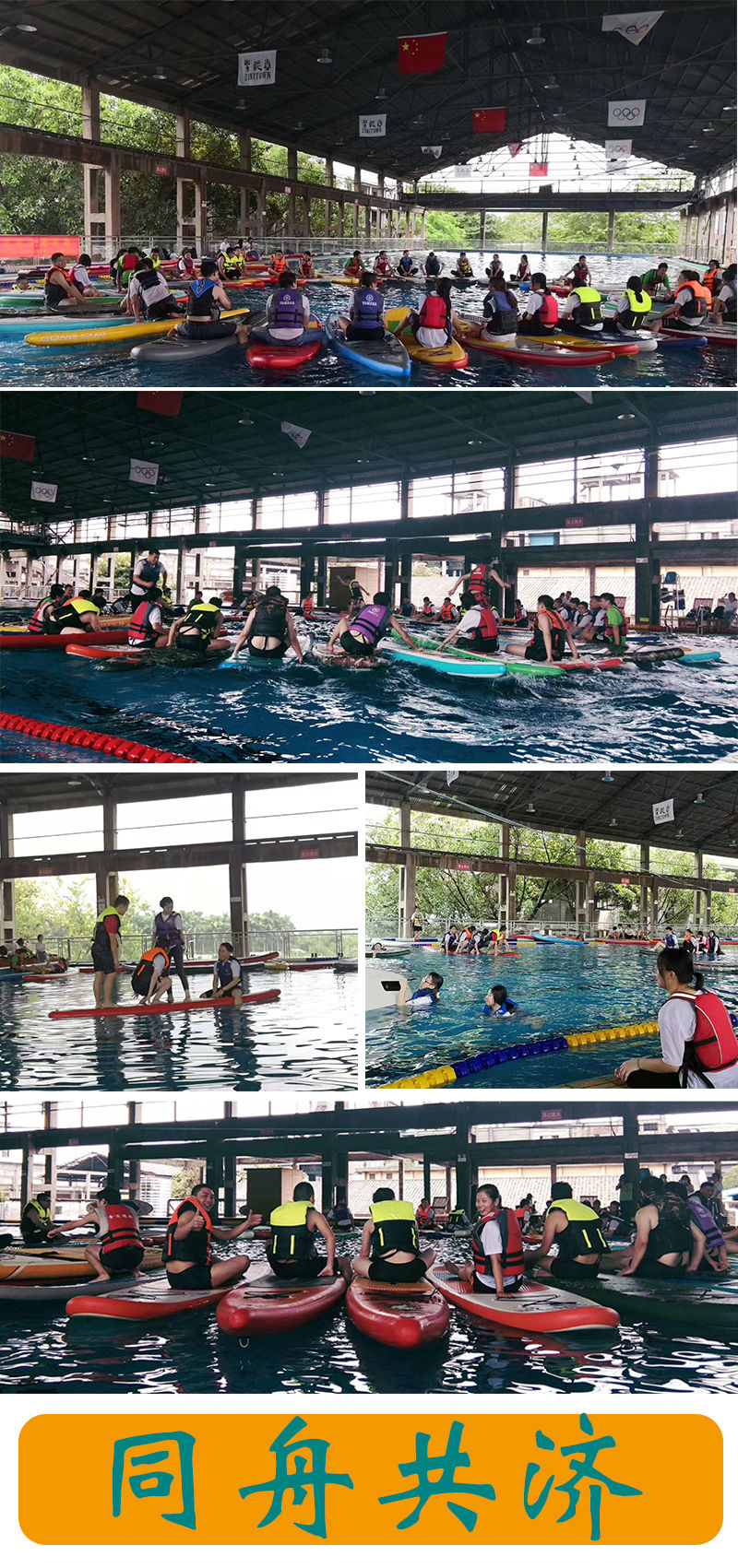 14:00,吃過午飯後,我們來到了下一個拓展基地——紫泥堂遊泳館。呀?大家來遊泳嗎?嘻嘻~這可猜錯了哦。我們來這裏進行的是一項水上(槳板)運動——風生水起·一槳成名 。
