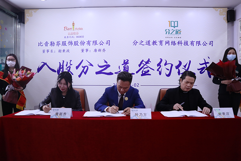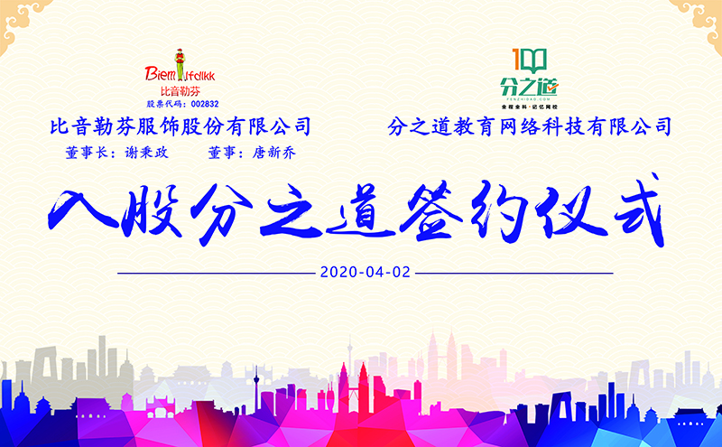 2020年4月2日,分之道教育網絡科技有限公司和比音勒芬服飾股份有限公司戰略合作入股簽約儀式在分之道公司總部隆重舉行。